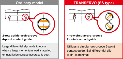 YAMAHA per i propri assi lineari utilizza sempre guide lineari a ricircolo di sfere di produzione giapponese e di altissima qualità. In particolare si tratta di guide con 4 ricircoli di sfere che garantiscono sempre 2 punti di contatto. Questa tecnologia permette di resistere ad alti carichi assiali e radiali così come a momenti flettenti. La tecnologia a ricircolo di sfere inoltre riduce al minimo i fenomeni di attrito, generando meno calore e permettendo quindi alte velocità di scorrimento con una lunga durata di vita.