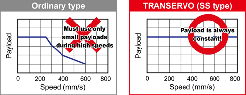 Sfruttando al massimo i vantaggi offerti dal metodo di controllo vettoriale, il TRANSERVO mantiene una portata costante anche nella applicazioni ad alta velocità. Questo aiuta a ridurre drasticamente il tempo ciclo. Combinando questa funzione con viti a ricircolo di sfere, il TRANSRERVO raggiunge una velocità massime di 1 metro al secondo.